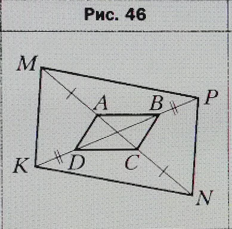 На рисунке 46 четырёхугольник ABCD — параллелограмм. На прямой АС отметили точки М и N, а на прямой BD — точки К и Р так, что AM = CN и BP = DK. Докажите, что четырёхугольник KMPN — параллелограмм