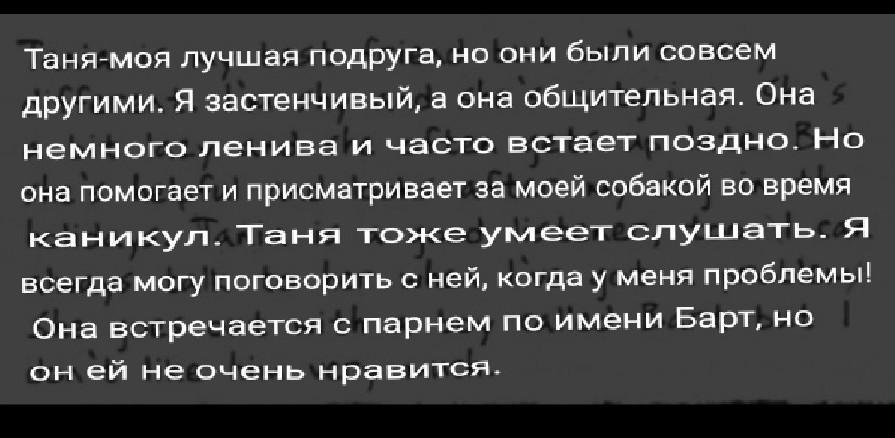 Таня моя лучшая подруга, но мы разные. Я стесняюсь, а она открыто говорит. Он немного ленив и часто ложится допоздна. Но он услужливый и присматривает за моей собакой в отпуске. Таня тоже хороший слушатель. \ Я всегда могу поговорить с ним, когда у него проблемы, он идет с мальчиком по имени Барт, но он мне не очень нравится.