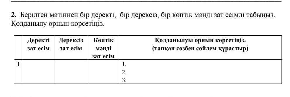 2. берілген мәтіннен бір деректі, бір дерексіз, бір көптік мәнді зат есімді табыңыз. қолданылу орнын көрсетініз