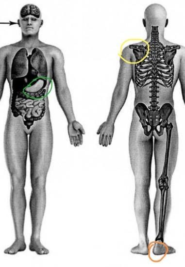 Оранжевым обведена пятка, жёлтым-плечо, зеленым-печень