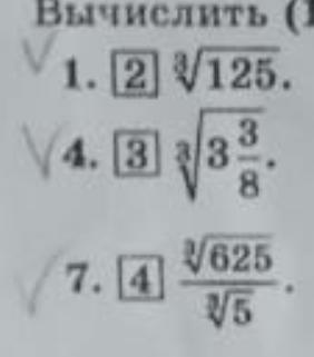 1. 5; 4. 3 3/8=27/8, кор3 (27/8)=3/2; 7. объединим кор3 (625/5)=кор3(125)=5.