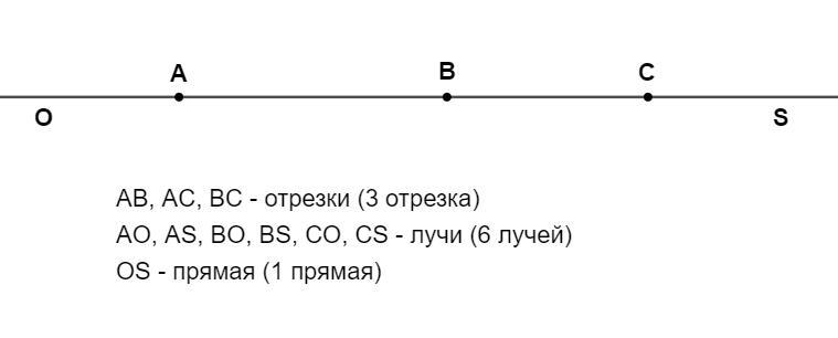 На прямой отметили три точки. Сколько разных объектов (отрезков, лучей, прямых) есть на рисунке?