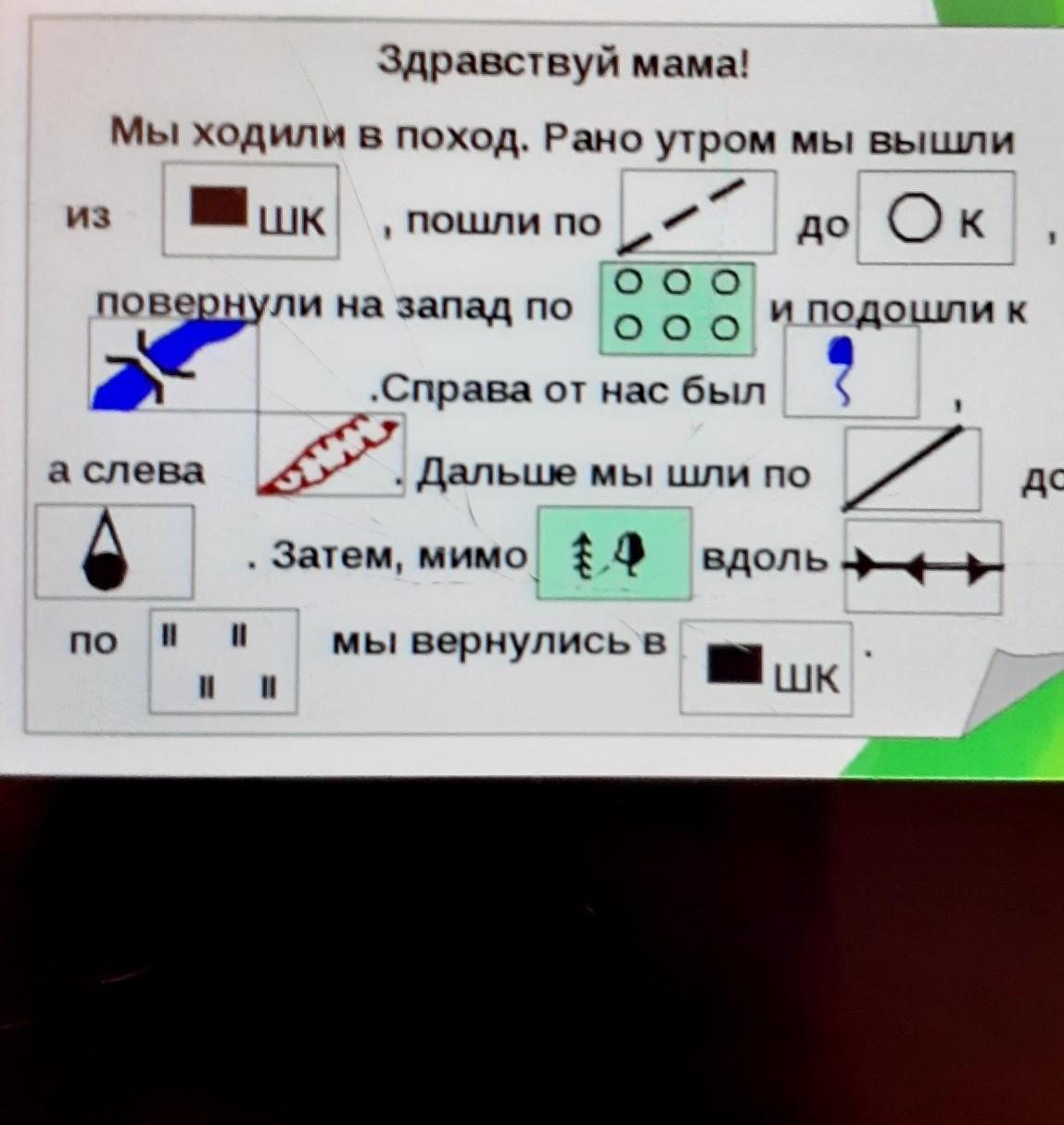 Мы ходили в поход. Рано утром мы вышли из школы, пошли по тропе до колодца, повернули на запад по фруктовому саду и подошли к мосту. Справа от нас был родник, а слева овраг. Дальше мы пошли грунтовой дороге до башни. Затем мимо смешанного леса вдоль линии электропередач по лугу мы вернулись в школу.