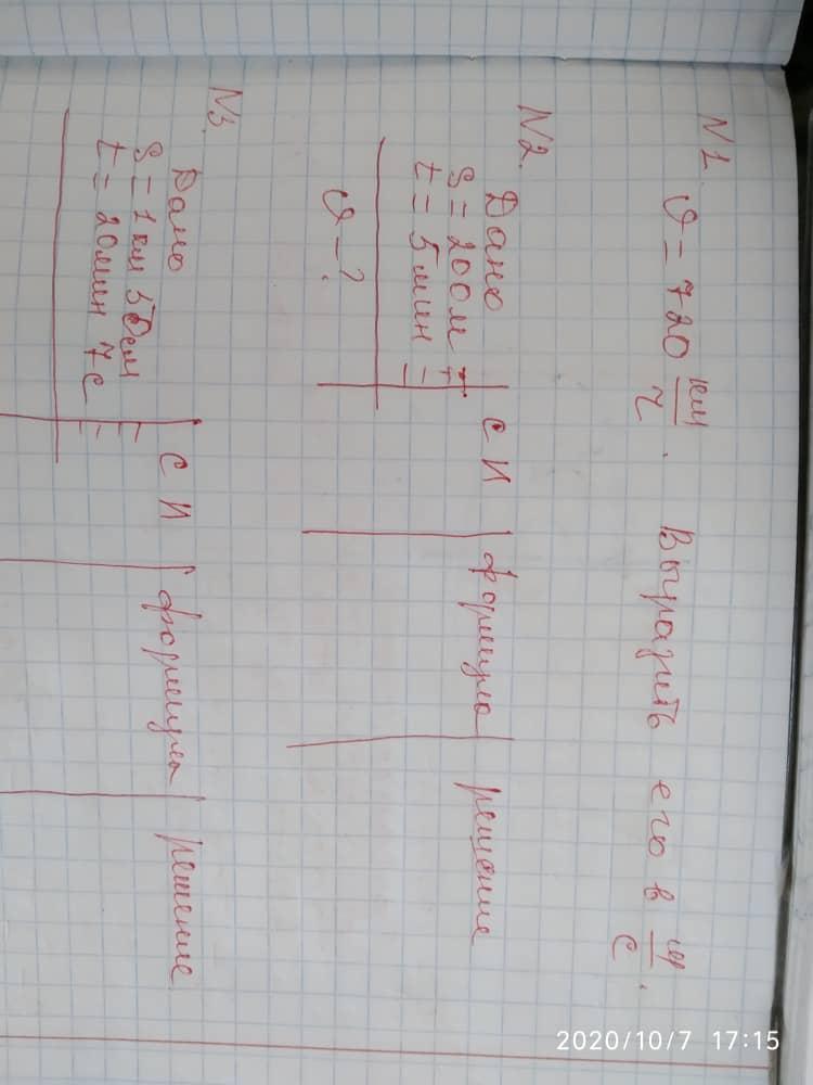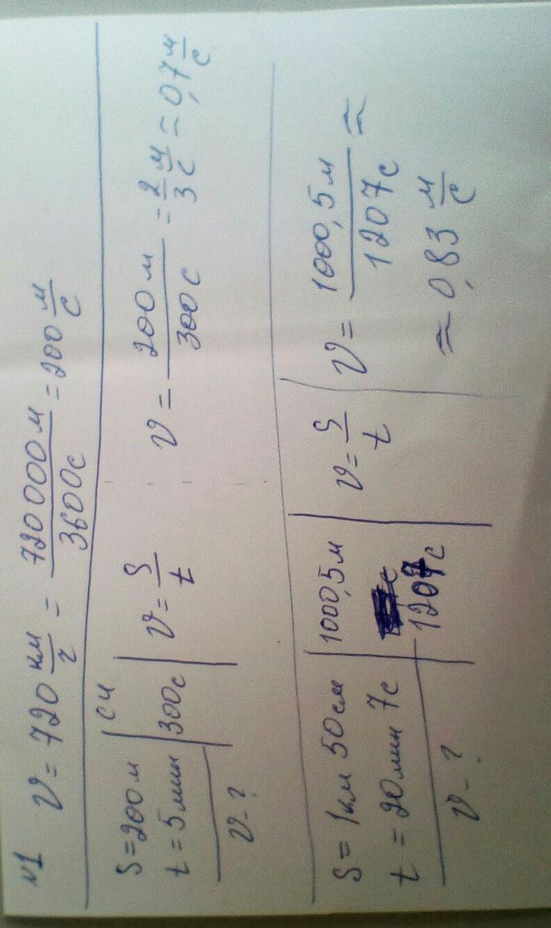№1) 720 км\ч =200 м\с №2) СИ: 0.2 км 1\12 часа формула: S\t=V решение: 0.2 : 1\12=2.4 км\ч №3)СИ : 1.05 км 0.335 часа формула:V=S\t V=1.05\0.335= 3.13 км \ч