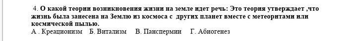 Гипотеза панспермии, согласно которой жизнь была занесена на Землю из космического пространства. Впервые была высказана Г. Рихтером в конце 19 столетия. Данная концепция допускает возможность происхождения жизни в разное время в разных частях Вселенной и переносе ее различными путями на Землю (метеориты, астероиды, космическая пыль).
