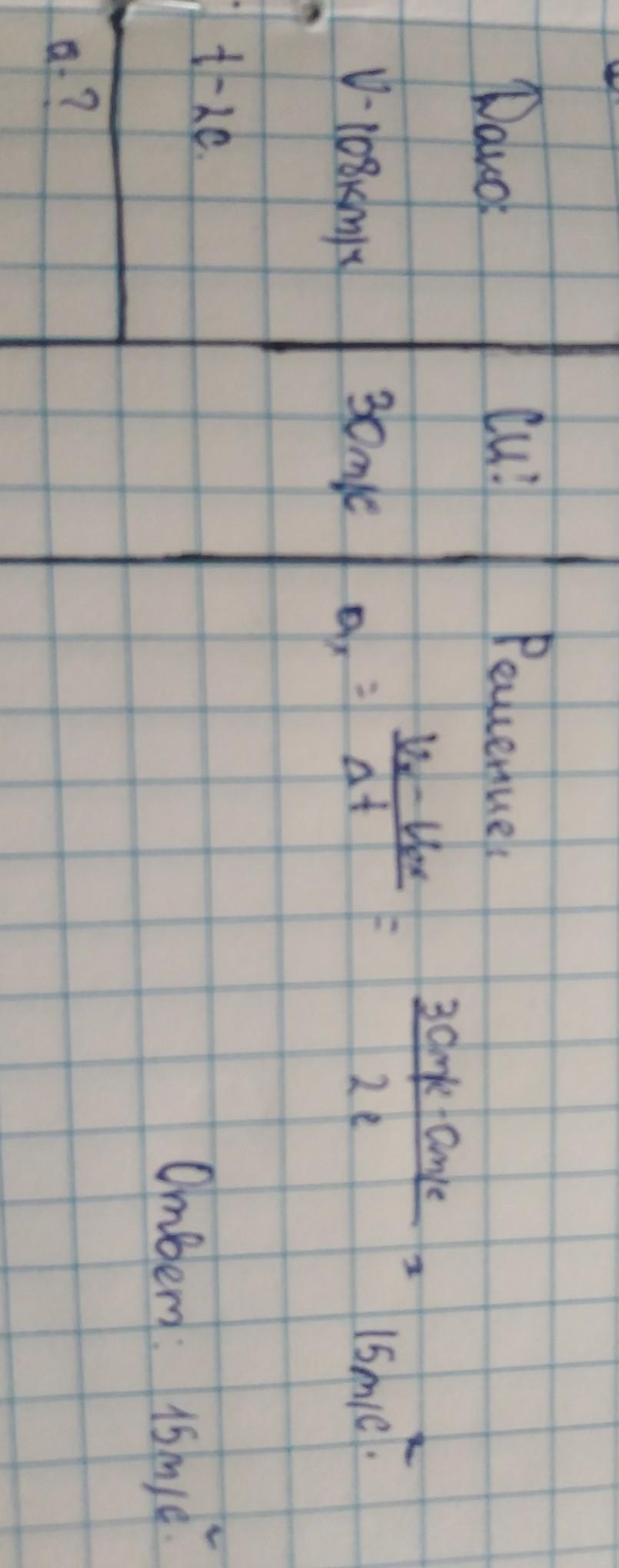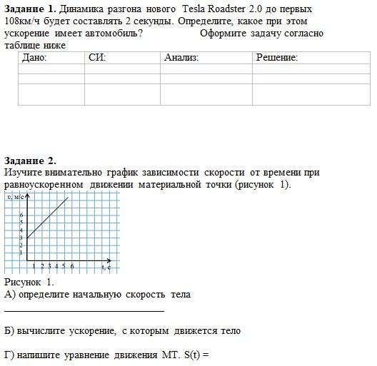 Динамика разгона нового Tesla Roadster 2.0 до первых 108км/ч будет составлять 2 секунды. Определите, какое при этом ускорение имеет автомобиль? Оформите задачу согласно таблице ниже