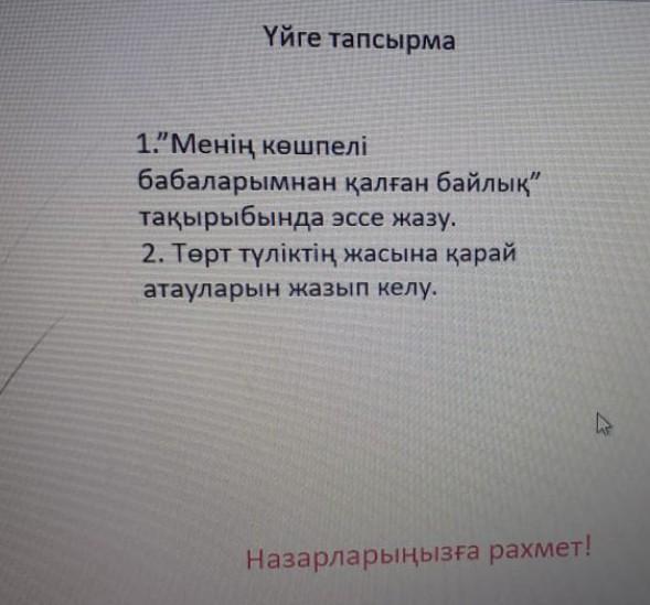 Менің көшпелі бабаларымнан қалған өте көп байлық бар. Олардың барлығы мен үшін өте қымбат. Және де әр қазақ үшін қымбат деп ойлаймын. Олардан қалған байлық-мұраны санауға сөз жетпес. Мысалы қазақтың ұлы байтақ жерлері, өазақ аспаптары,мысалы: домбыра; қобыз және т.б. Мен олардың бізге қалдырған мұрасын өте қатты бағалаймын.