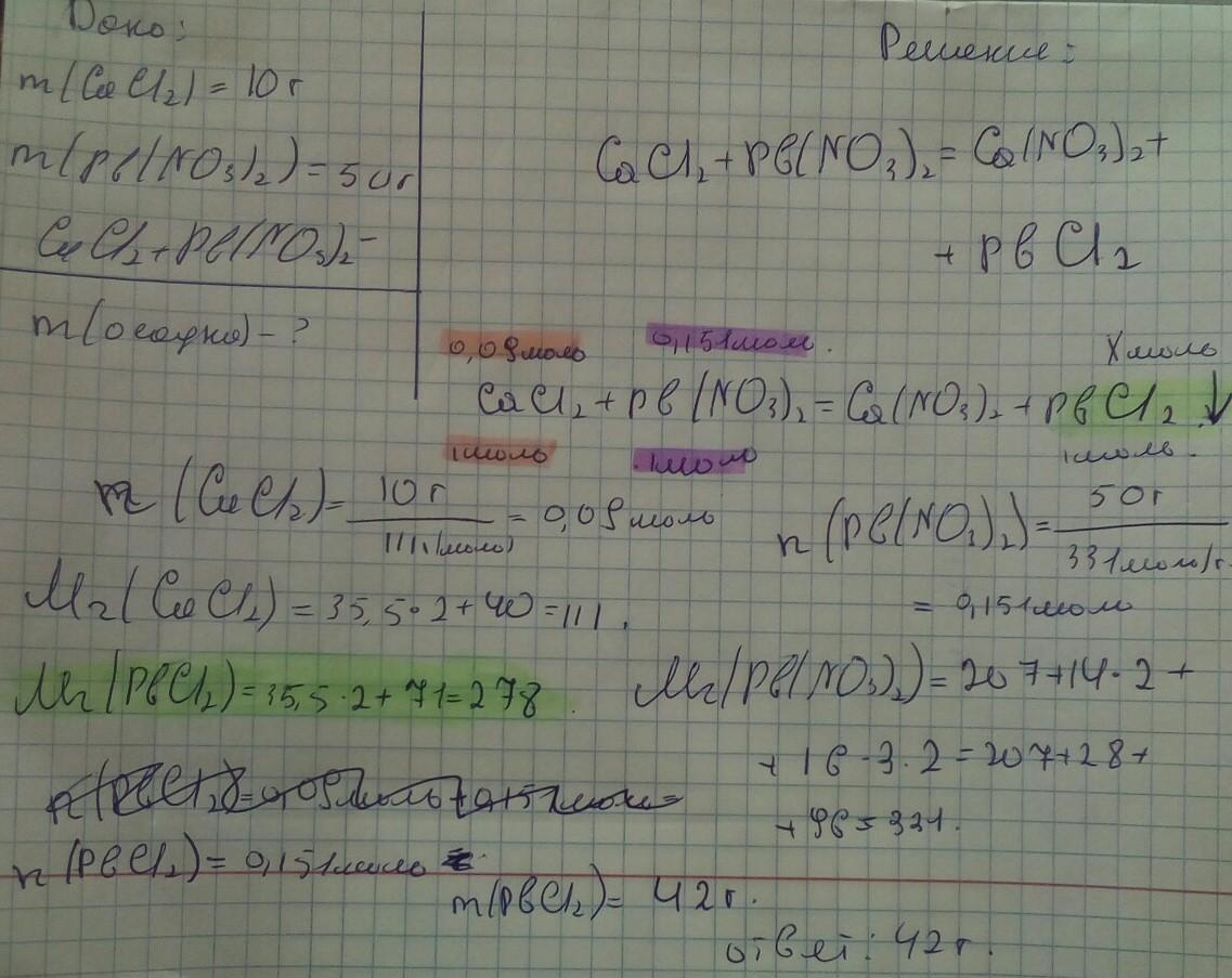 Рассчитайте массу осадка, образовавшегося при взаимодействии 10г хлорида кальция и 50г нитрата свинца(II)