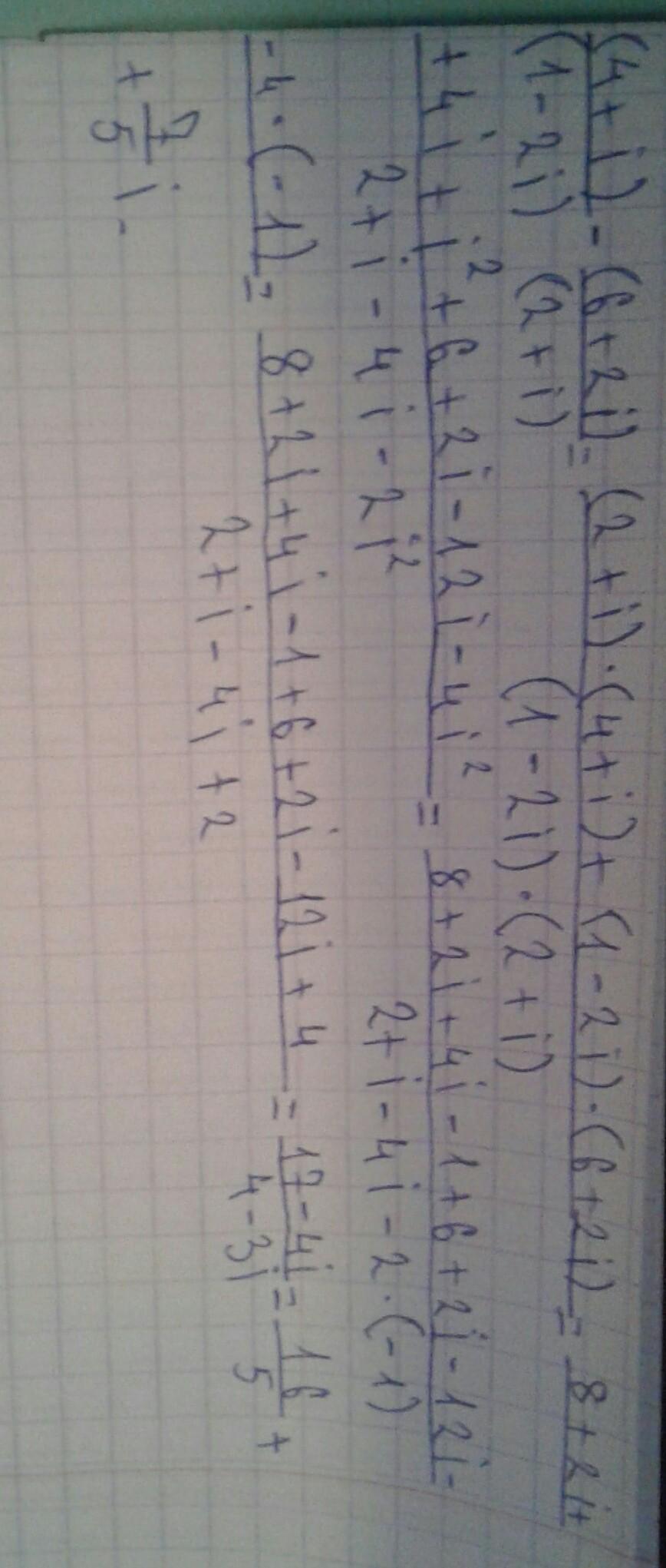 (4+i)/(1-2i)-(6+2i)/(2+i)=16/5+7/5i