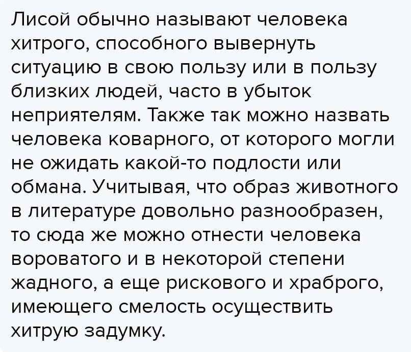 Лисой обычно называют человека хитрого, способного вывернуть ситуацию в свою пользу или в пользу близких людей, часто в убыток неприятелям. Также так можно назвать человека коварного, от которого могли не ожидать какой-то подлости или обмана. Учитывая, что образ животного в литературе довольно разнообразен, то сюда же можно отнести человека вороватого и в некоторой степени жадного, а еще рискового и храброго, имеющего смелость осуществить хитрую задумку.