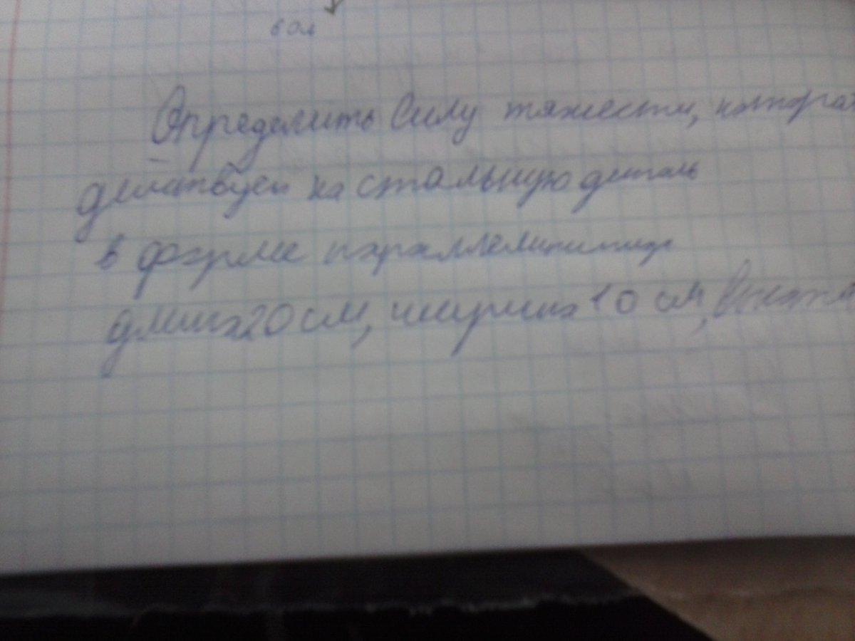 определить силу тяжести,которая действует на стальную деталь в форме параллелипипида.длина 20 см,ширина 10 см,высота 5 см