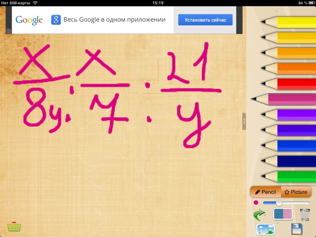 (x/8y) : (x/7) : (21/y) = (x/8y) : (x/7) * (y/21) = (x/8) : (x/7) * (1/21) =