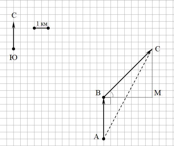Первая часть пути, обозначенная АВ, является стороной треугольника АВС и равна 3 км.