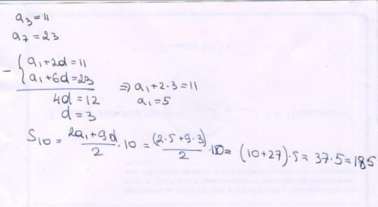 Третий и шестой члены арифметической прогрессии равны 11 и -4 соответственно. Сумма десяти первых членов арифметической прогрессии равна?