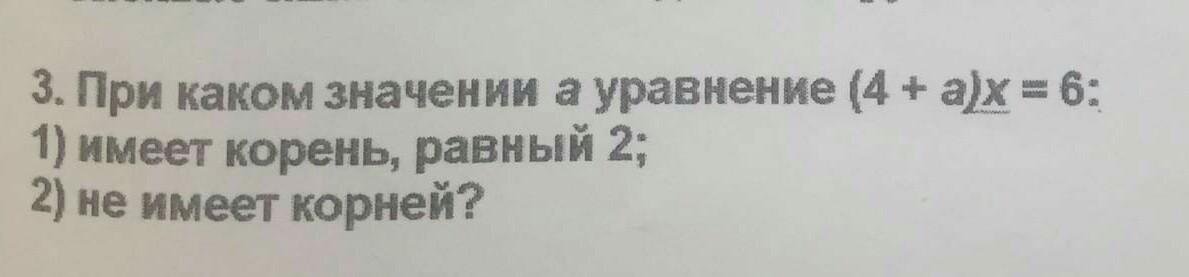 при каком значение а уравнение (4+а)x=6 1) корень имеет, равный 2 2) не имеет корней