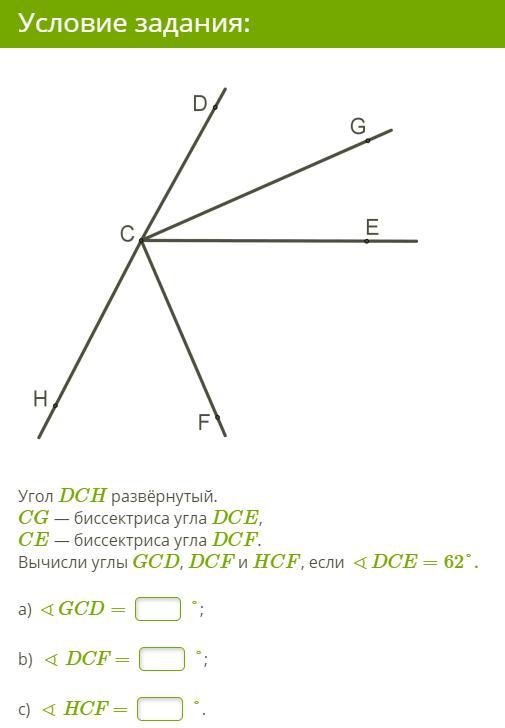 c) ∠HCF=∠DCH-∠DCF. Так как ∠DCH - развернутый, то ∠DCH=180°.