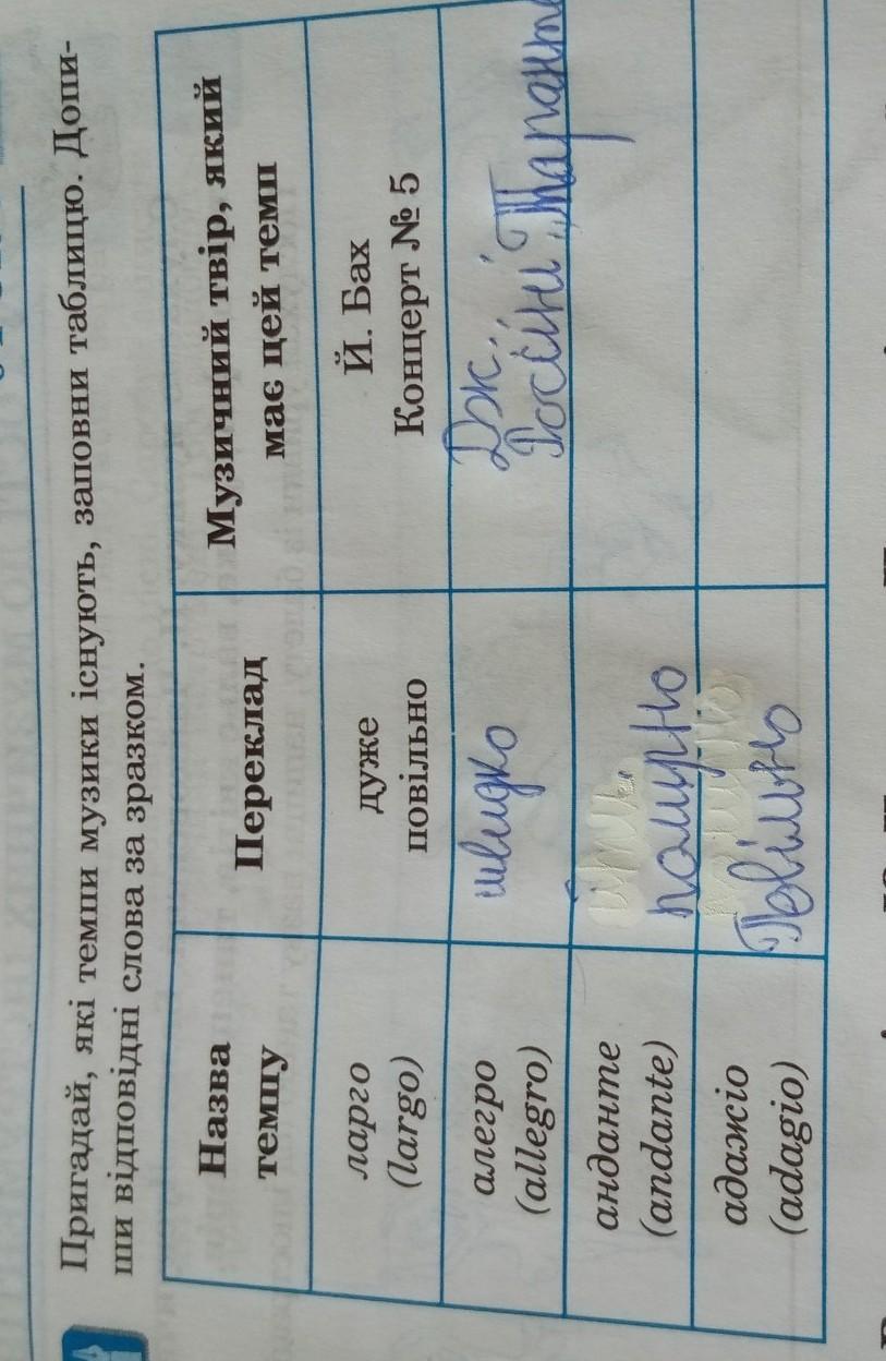 Пригадай, які темпи музики існують, заповни таблицю. Допиши