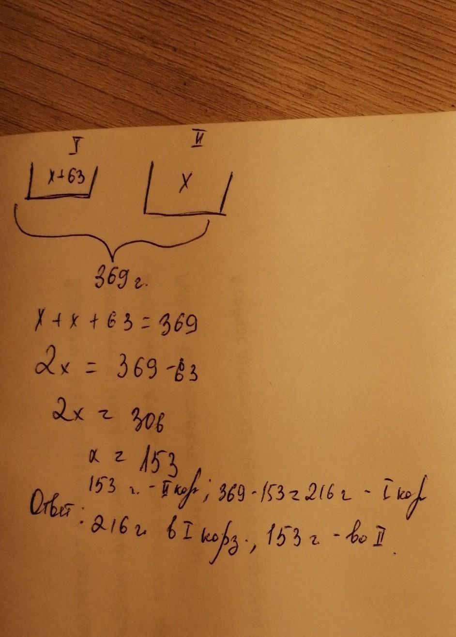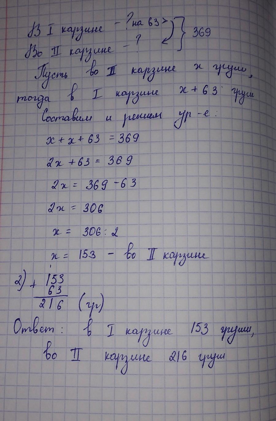 Всего в двух карзинах 369 груш. Известно что в1 карзине на 63 груши больше, чем во 2 карзине. Сколько груш в каждой карзине?