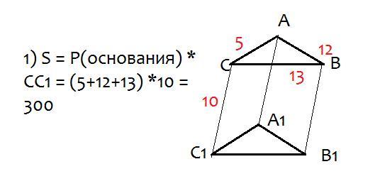 Відстані між паралельними прямими, які містять бічні ребра похилої трикутної призми, дорівнюють 5 см, 12 см, і 13 см, а бічні ребра 10 см. Знайти бічну поверхню призми. СРОЧНО!!! (детальний розв'язок, якщо можна)