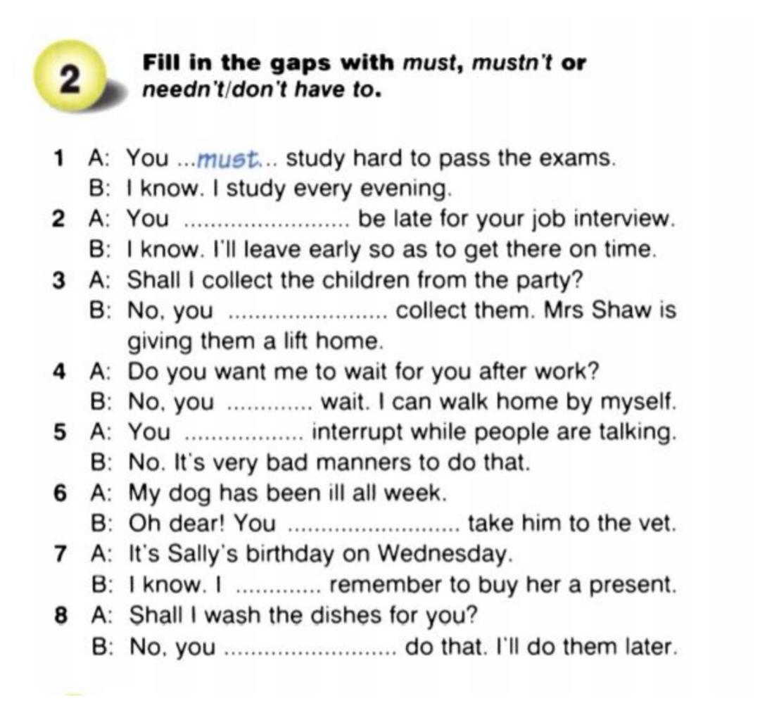 2. mustn't 3. don't have to 4. needn't 5. mustn't 6. must 7. must 8. needn't
