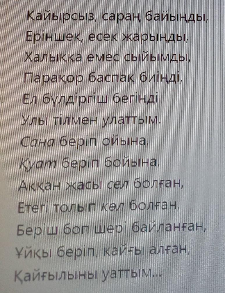 помогите пожалуйста Өлең жолдарын оқып, курсивпен берілген сөздерге дыбыстық талдау жазыңыз