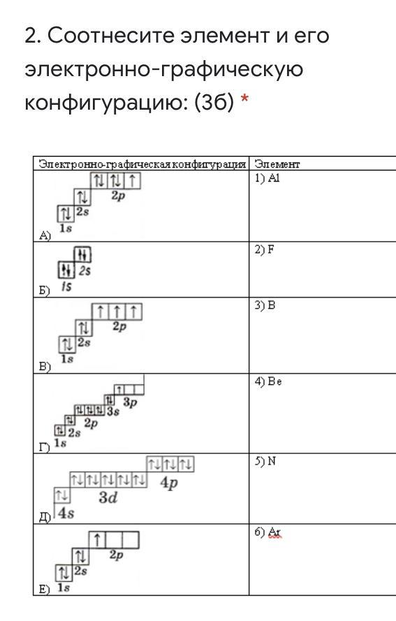 Соотнесите элемент и его электронно-графическую конфигурацию: