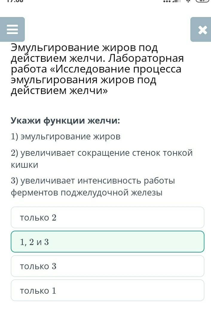Укажи функции желчи: 1) эмульгирование жиров 2) увеличивает сокращение стенок тонкой кишки 3) увеличивает интенсивность работы ферментов поджелудочной железы