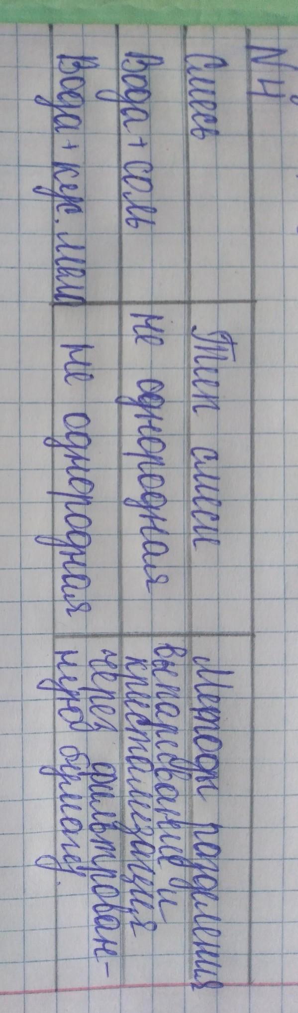 вода+песок:тип смеси не однородная ;способ разделения через фильтрованную бумагу.Вода+пов.соль тип смеси не однородная, способ разделения выпаривание и кристаллизация. Опилки железа+опилки дерева вид смеси не однородная, способ разделения отставание. Вода+бензин вид смеси не однородная способ разделения через длительную воронку или отстаивание