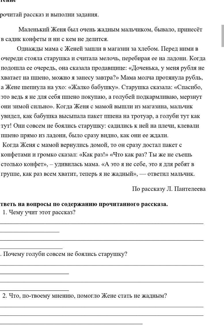 3.Жене помогло быть не жадным момент, в котором мама Жени дала рубль бабушке и в момент где бабушка кормит голубей они будто благодарили бабушку, что она даёт им покушать в такую мёрзлую зиму.
