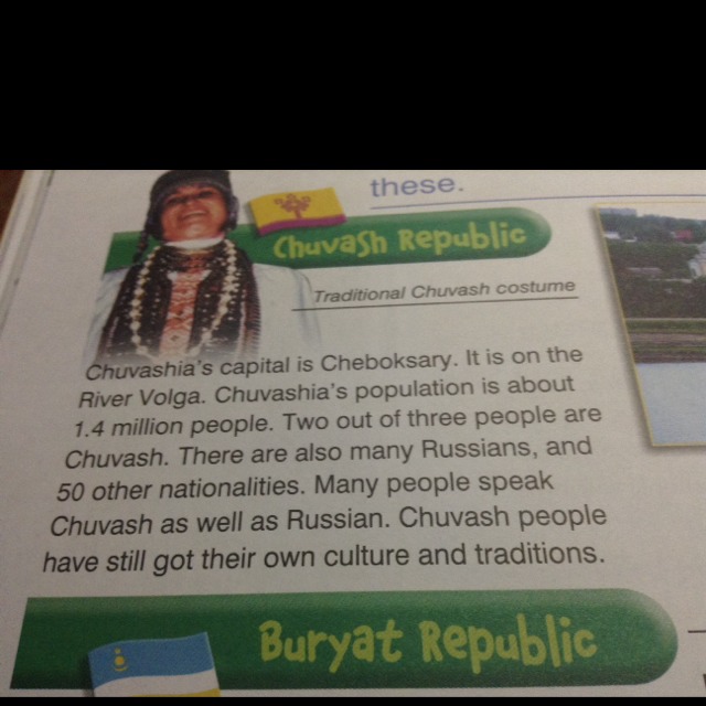 Столица Чувашии - город Чебоксары. Он стоит на реке Волге. Население Чувашии составляет около 1,4 млн человек. Два из трёх жителей - чуваши. Также там много русских и людей 50 других национальностей. Многие говорят на чувашском, а также на русском. У чувашей до сих пор есть своя культура и традиции.