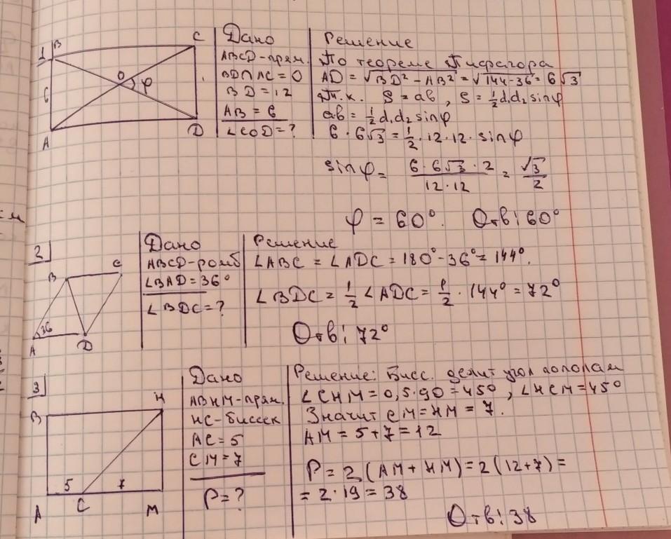 Усложнили решение первой задачи. В прямоугольнике диагонали равны и в точке пересечения делятся пополам. Поэтому OC=OD=6 см. Противоположные стороны тоже равны, и CD=AB=6 см. Получили, что ΔCOD – равносторонний, и все углы, в частности, и ∠COD=60°.