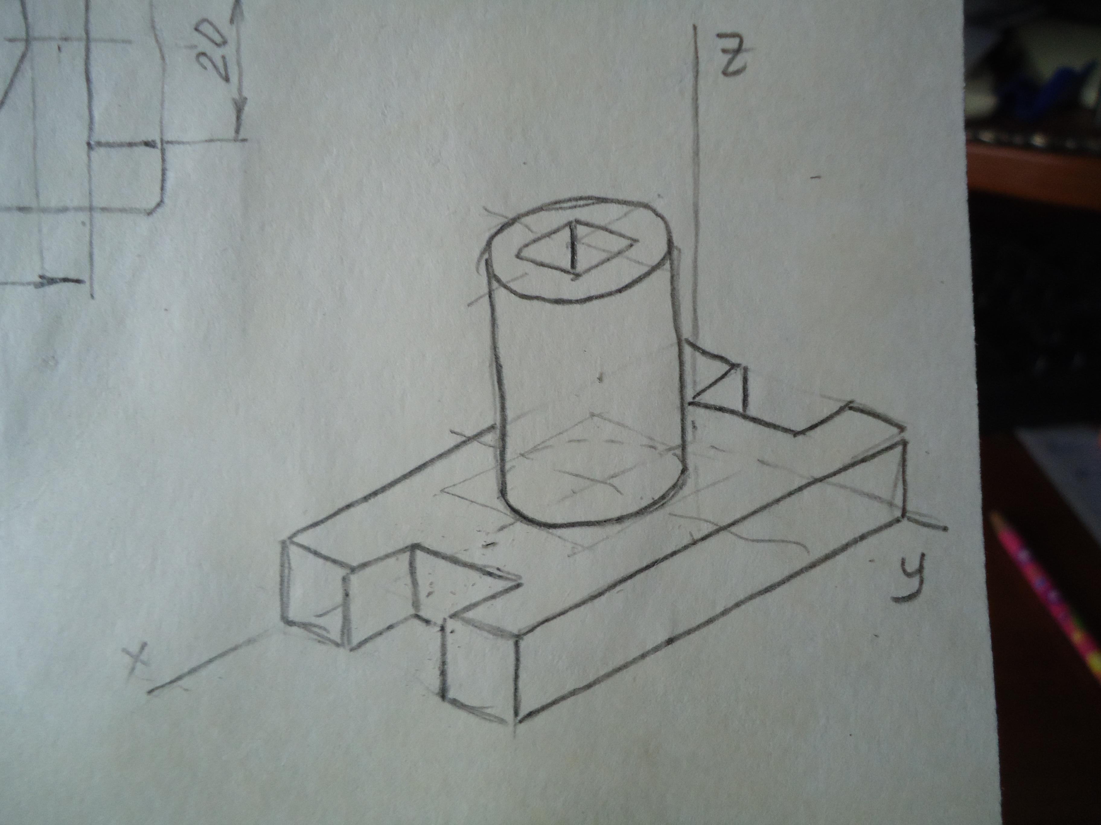 Опора состоит из прямой четырехугольной призмы и цилиндра, поставленного в центре верхней грани призмы. Разрезы призмы: длина 75 мм, ширина 40 мм высота 10 мм. Размеры цилиндра: диаметр 30 мм, высота 40 мм. Призма имеет прямоугольные пазы, выполненные посередине её меньших граней. Ширина пазов 20 мм, длина 10 мм и глубина 10 мм. Вдоль оси цилиндра проходить глухое призматическое отверстие, в основании которого квадрат со стороной 15 мм. Глубина отверстия 20 мм