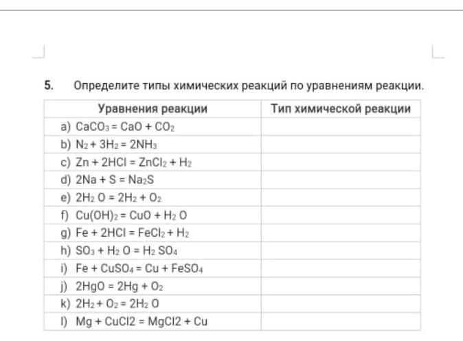 Определите типы химических реакций по уравнениям реакции.
