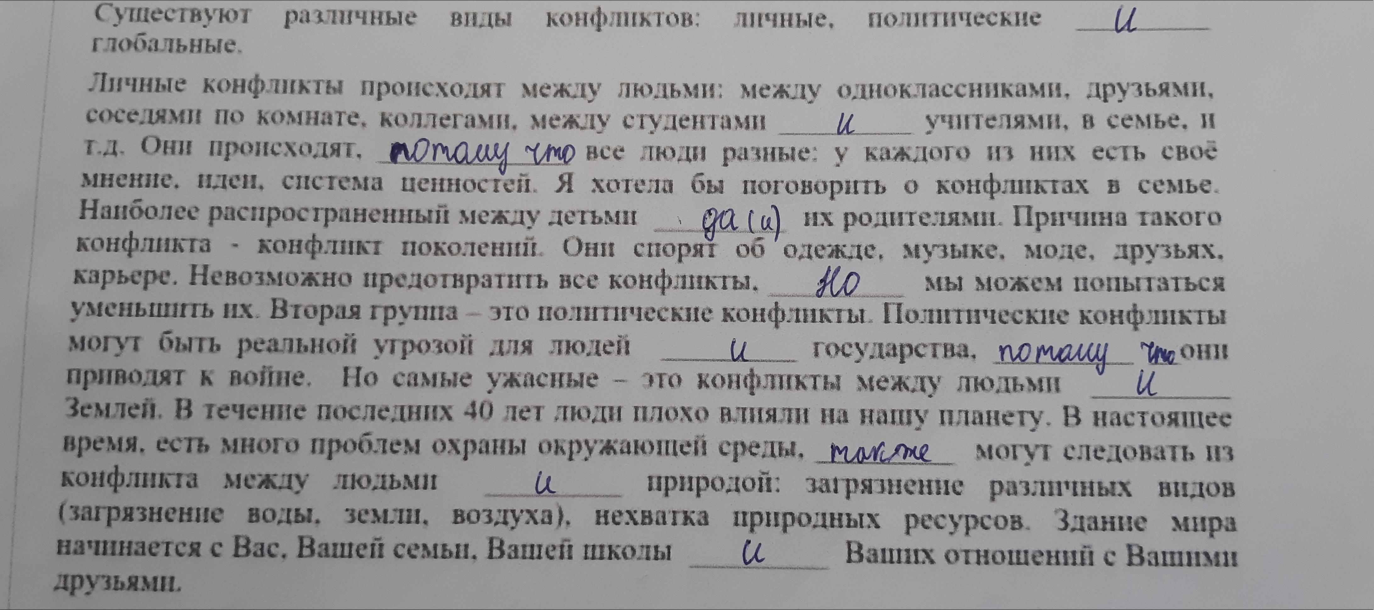 Личные конфликты происходят между людьми: между одноклассниками, друзьями, соседями по комнате, коллегами, между студентами _________ учителями, в семье, и т.д. Они происходят, _____________ все люди разные: у каждого из них есть своё мнение, идеи, система ценностей. Я хотела бы поговорить о конфликтах в семье. Наиболее распространенный между детьми _________ их родителями. Причина такого конфликта - конфликт поколений. Они спорят об одежде, музыке, моде, друзьях, карьере. Невозможно предотвратить все конфликты, _________ мы можем попытаться уменьшить их. Вторая группа – это политические конфликты. Политические конфликты могут быть реальной угрозой для людей _________ государства, _________ __они приводят к войне. Но самые ужасные – это конфликты между людьми _________ Землей. В течение последних 40 лет люди плохо влияли на нашу планету. В настоящее время, есть много проблем охраны окружающей среды, _________ могут следовать из конфликта между людьми _________ природой: загрязнение различных видов (загрязнение воды, земли, воздуха), нехватка природных ресурсов. Здание мира начинается с Вас, Вашей семьи, Вашей школы _________ Ваших отношений с