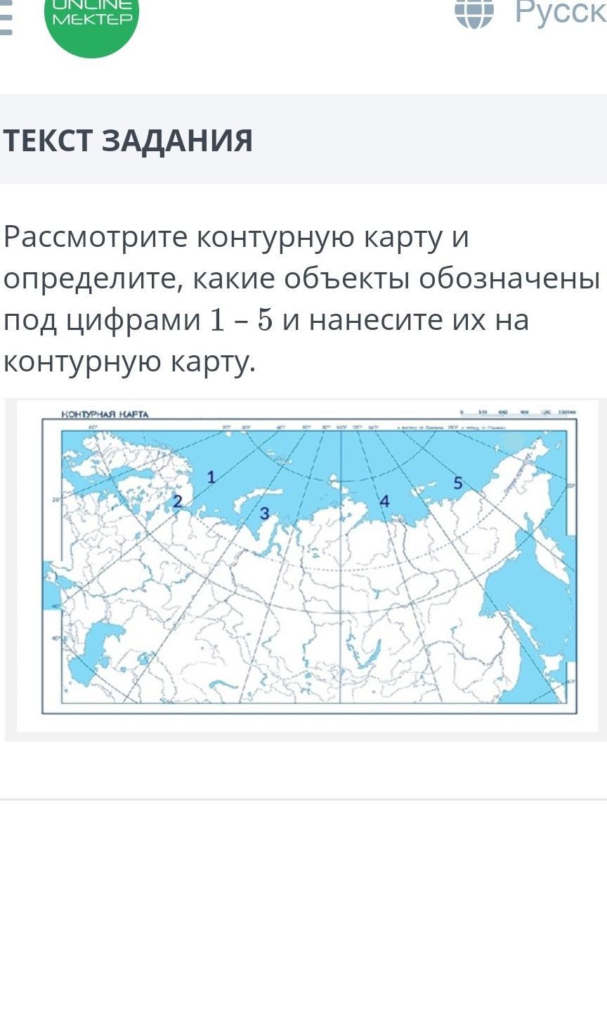 Рассмотрите контурную карту и определите какие объекты обозначены под цифрами 1-5 и найдите их на контурной карте