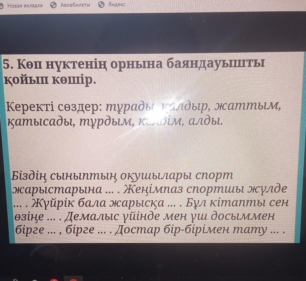 Көп нүктенің орнына баяндауышты қойып көшір. Керекті сөздер: тұрады, қалдыр, жаттым, қатысады, тұрдым, келдім, алды. ПОМОГИТЕ 75 БАЛЛОВ