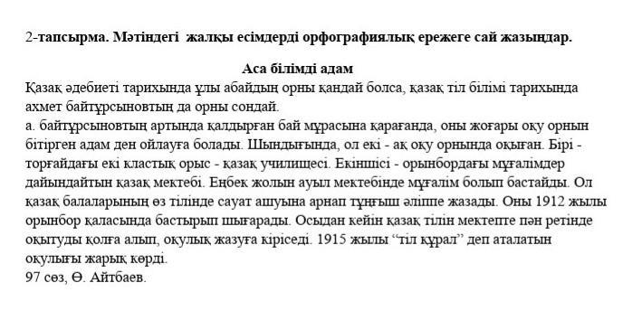2-тапсырма. Мәтіндегі жалқы есімдерді орфографиялық ережеге сай жазыңдар. ПОМОГИТЕ МНЕ СРОЧНО НУЖНО 8 КЛАСС
