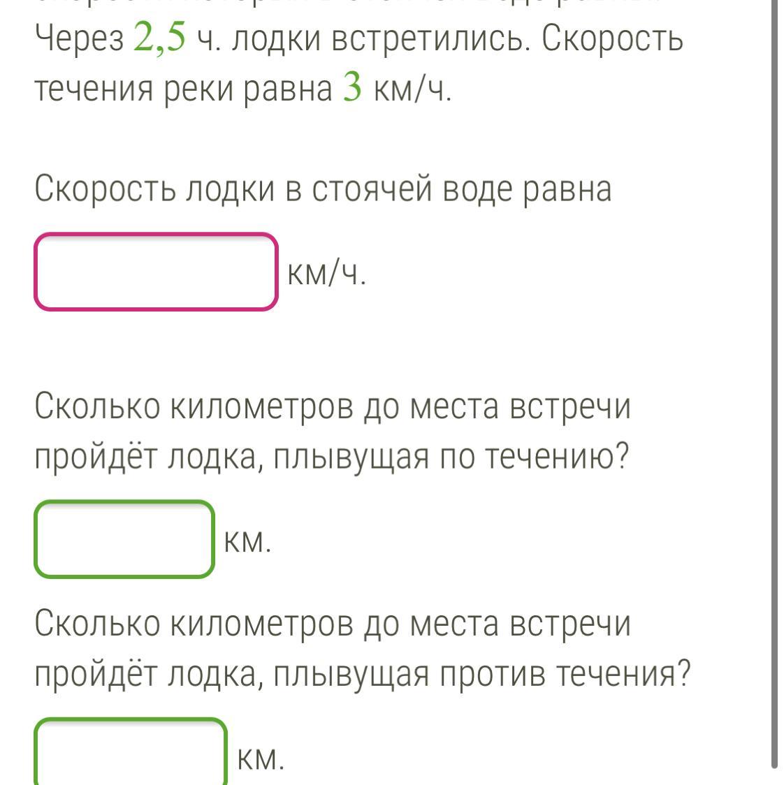 подскажите пожалуйста!! очень надо скорее!!!Расстояние между двумя пристанями равно 110 км. Из них одновременно навстречу друг другу вышли две лодки, скорости которых в стоячей воде равны. Через 2,5 ч. лодки встретились. Скорость течения реки равна 3 км/ч.