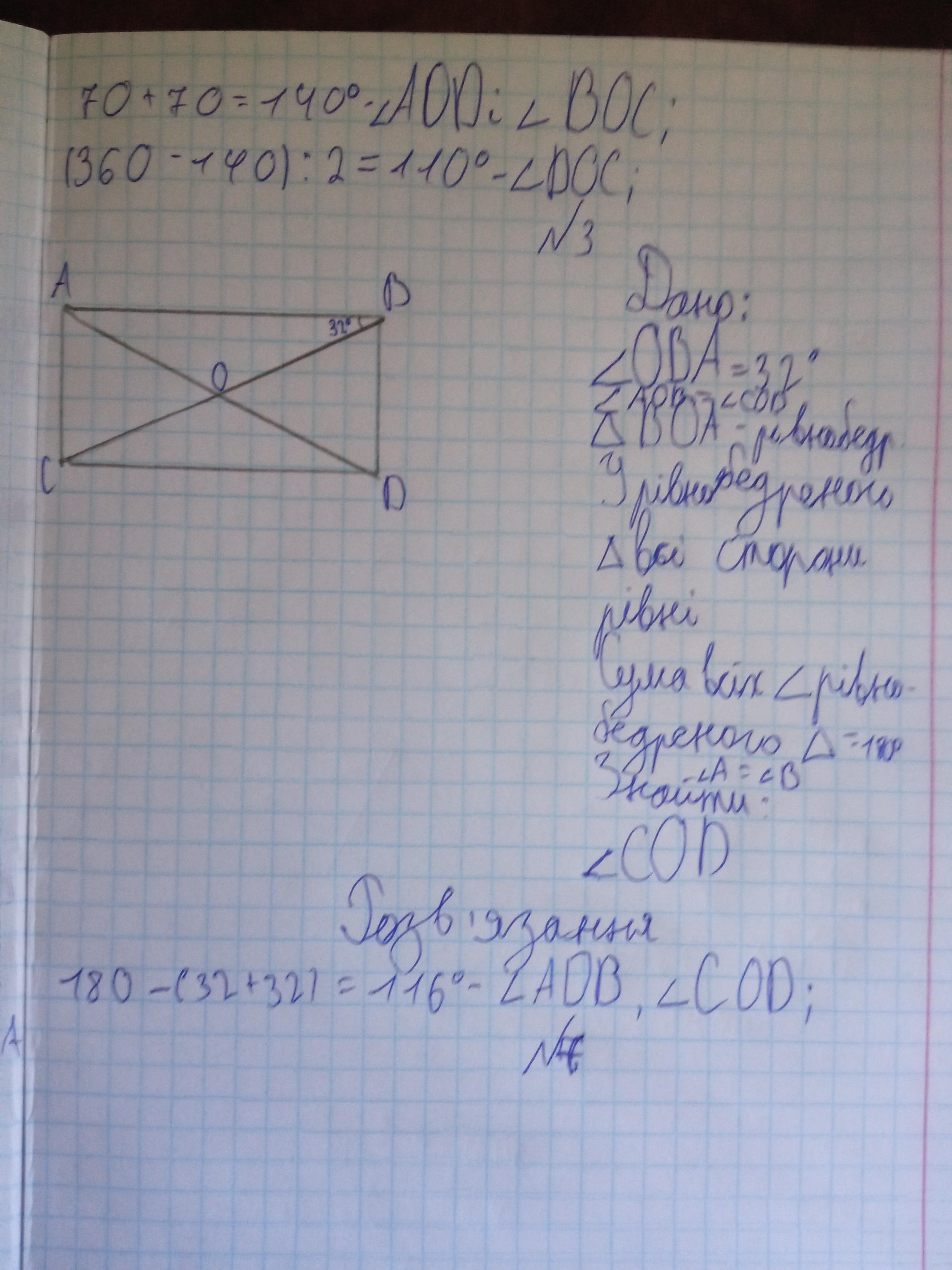 У прямокутнику діагональ утворює з більшою стороною кут, що дорівнює 32°. Знайти кут між діагоналями, який лежить проти більшої сторони прямокутника.