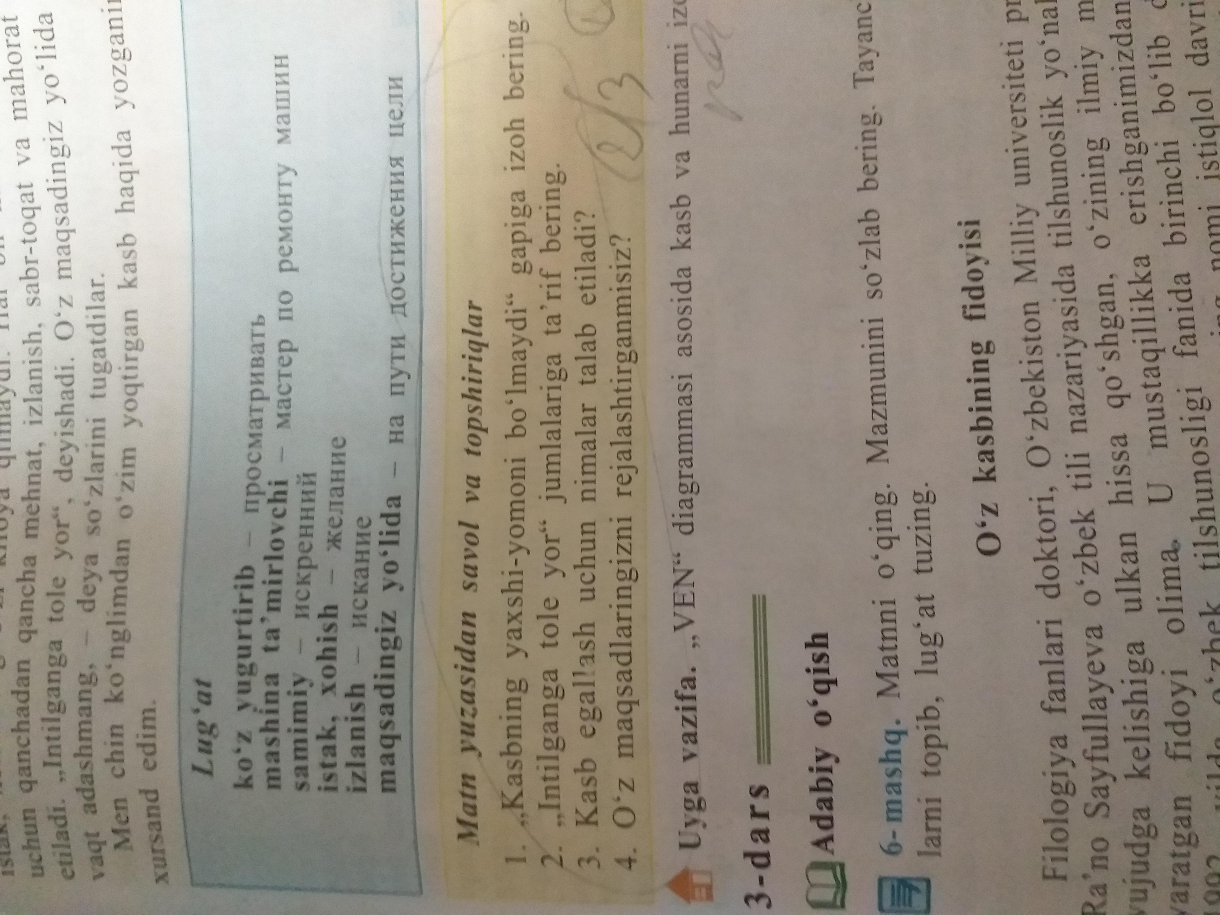 1) darhaqiqat kasb hunarning yaxshi yomoni bolmaydi. Chunki har kasbning oziga yarasha foydasi va qiyinchiliklari mavjud.