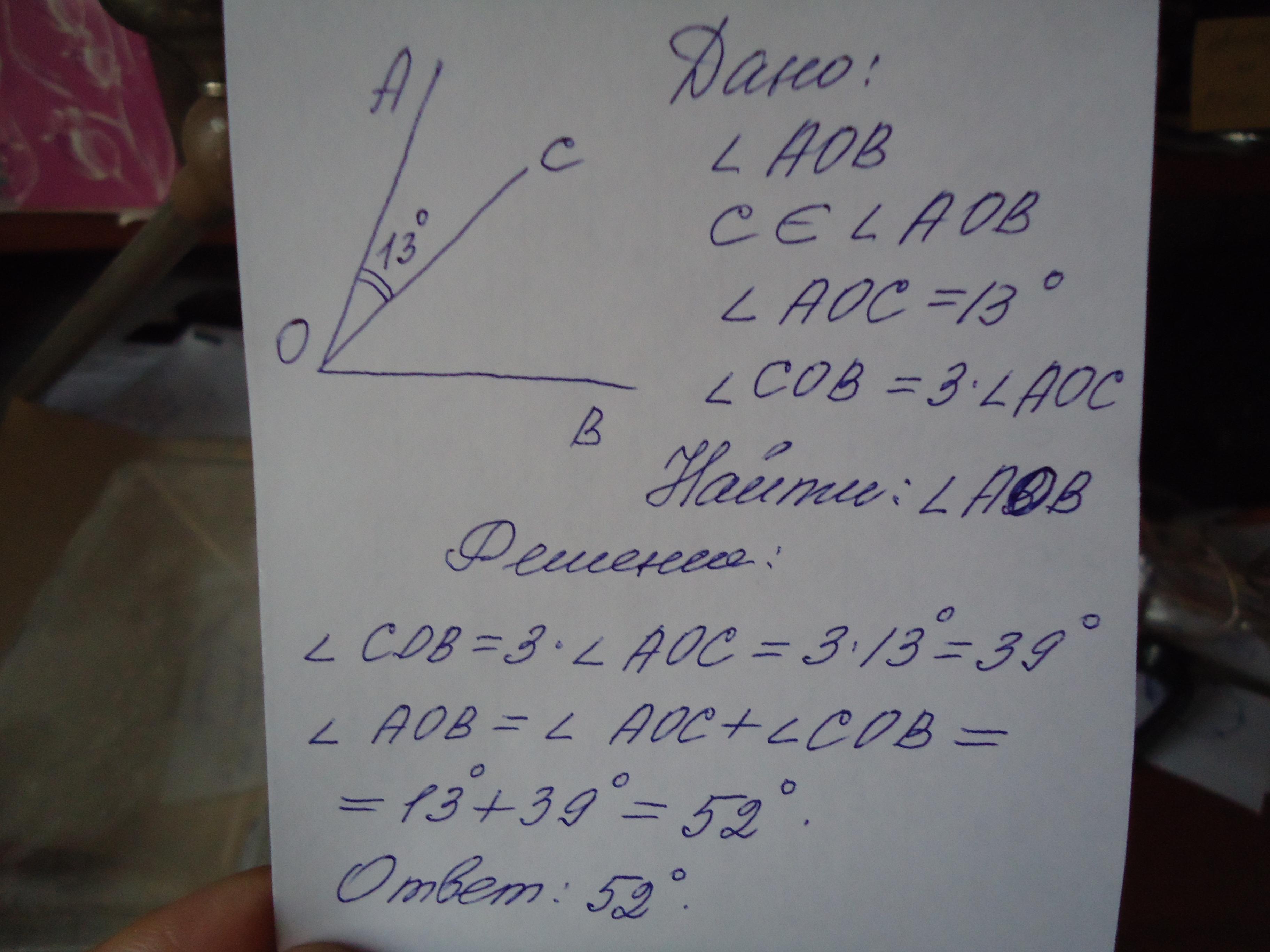 c) найдите величину угла АОВ, если АОС=13 0 , ВОС в 3 раза больше АОС.