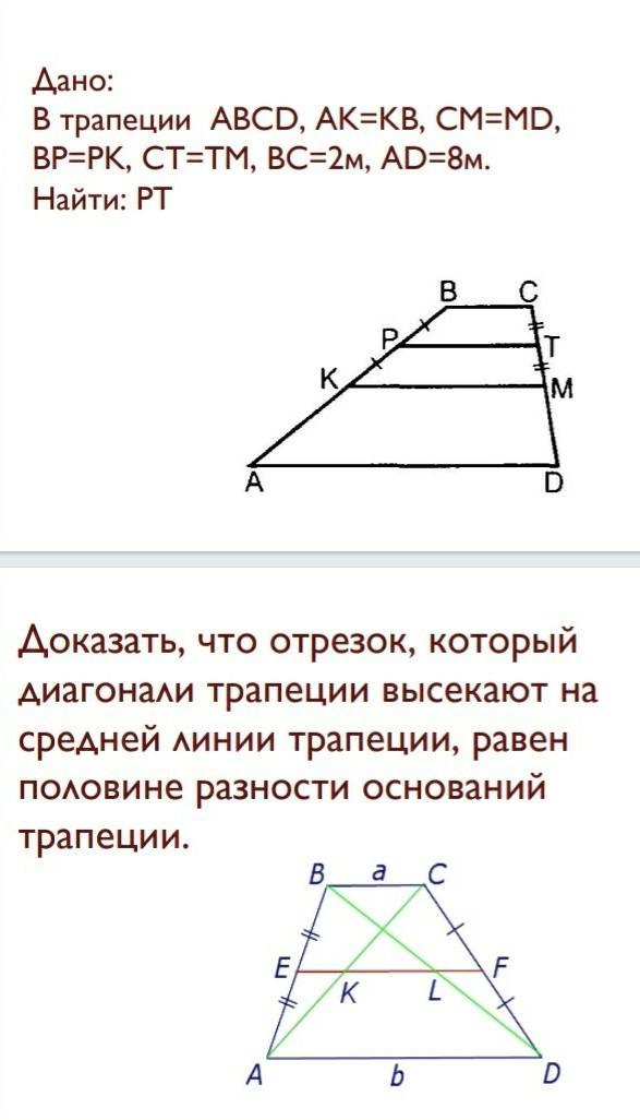 РТ = (КМ + ВС)/2 = (5 + 2)/2 = 7/2 = 3,5 см