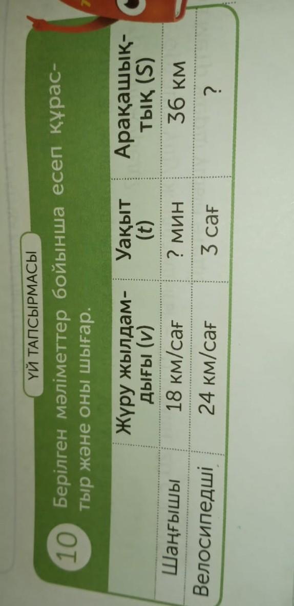 Шаңғышы мен велосипедші саябақты бір уақытта айналып шықты.Шаңғышы18км/сағ жылдамдықпен,ал велосипедші 24км/сағ жылдамдықпен.Екеуібіржерде кездесуі үшін велосипедші 3 сағатта неше км жүрру керек,ал шаңғышы қанша минутта 36км жүрді