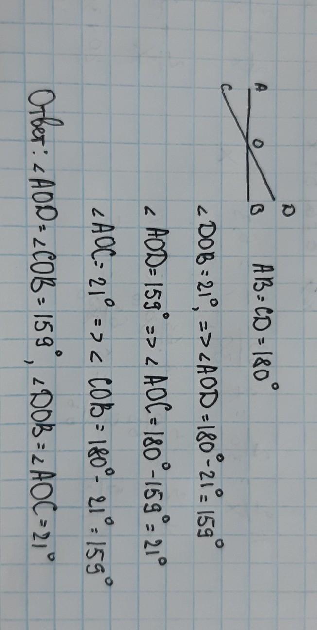 один из углов образовавшихся при пересечении двух прямых равен 21°. Найдите остальные неразвёрнутые углы