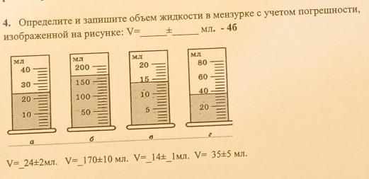 определите и запишите обьем жидкости в мензурке с учетом погрешности изображений на рисунке