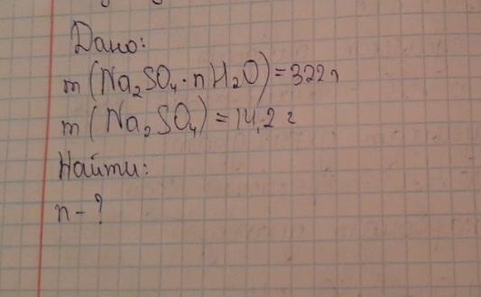 Кристалогідрат Na2SO4 * n H2O масою 322г прожарили. Добули безводну сіль масою 14,2 гр. Визначте число молекул води у кристалогідраті
