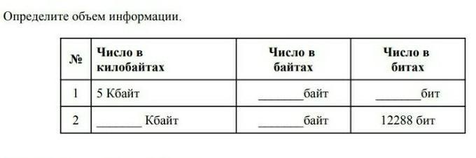 определите объем информации Число в килобайтах Число в байтах Число в битах 1 5 кбайт __байт __бит 2__кбайт __байт 12288 бит