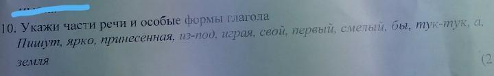 пишут-глаг,ярко-нареч,принесённая-прич,из-под-предл,играя-деепричастие,свой-мест,первый-числ,смелый-прил,земля-сущ