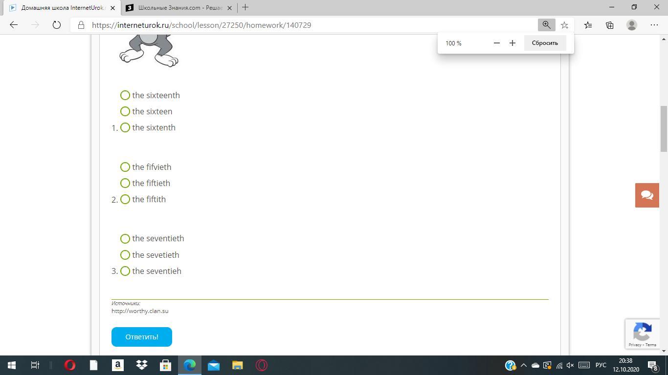 Here are the words but the letters are mixed up. Write the correct variant. (Даны слова, но буквы перепутаны. Напиши правильное слово). Example 0. neo Answer 0. one 1. teenfif 2. tyfif 3. teeneigh