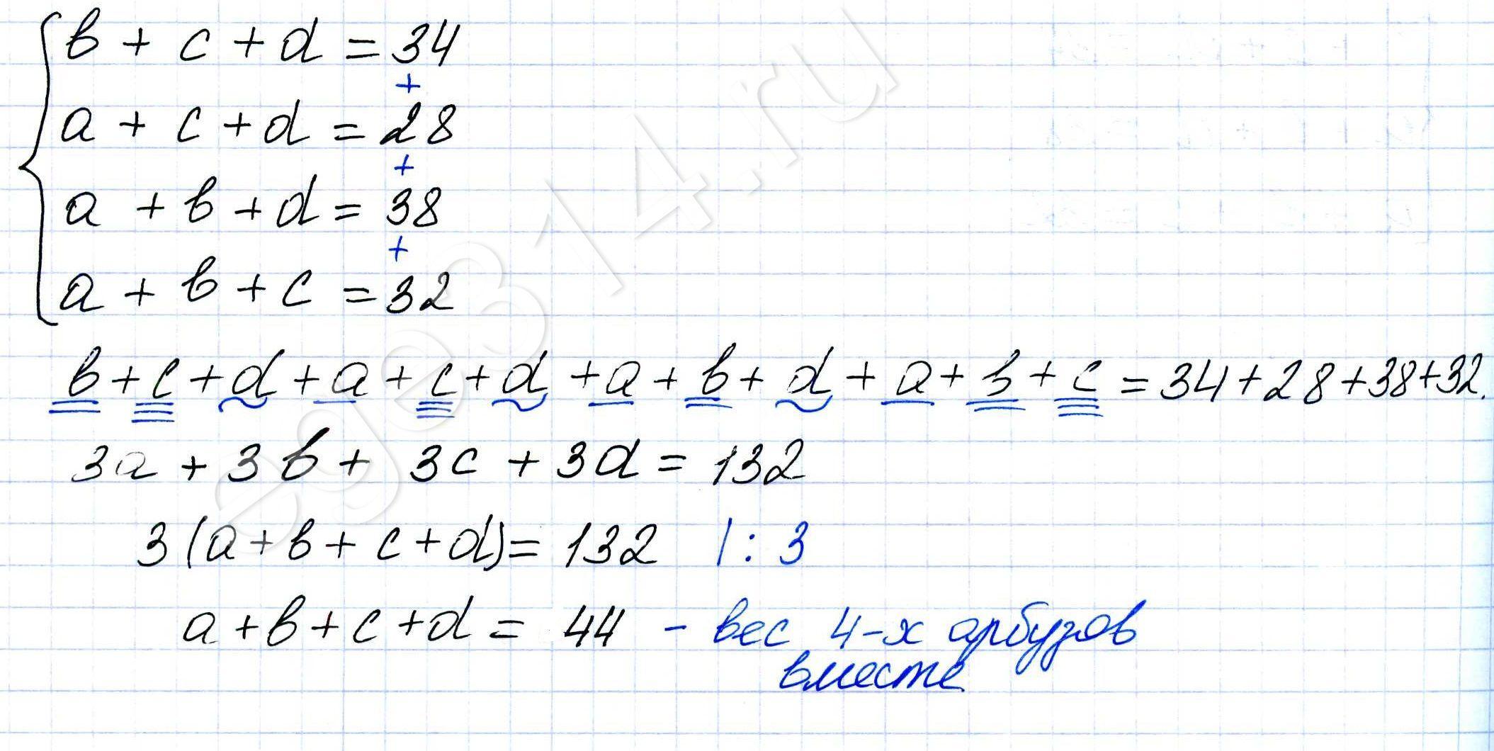 Обозначим 1-й арбуз а, 2-й арбуз b, 3-й арбуз c, 4-й арбуз d. Из условий задачи составим систему уравнений и найдём сколько весят 4-ре арбуза вместе: